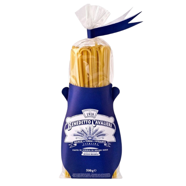 Le Linguine Benedetto Cavalieri sono una pasta artigianale prodotta con grano duro italiano. Più sottili dei normali spaghetti, sono a sezione rettangolare, cuociono in 7/8 minuti e tengono magnificamente la cottura.