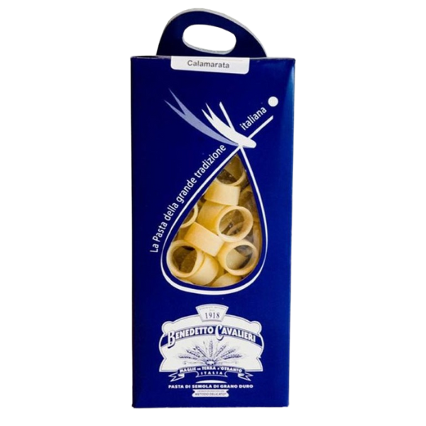 La calamarata Benedetto Cavalieri è uno dei tipi di pasta di grano duro appartenente alla famiglia dei paccheri. Ottima coi frutti di mare, oppure unita al ragù o ancora condita con salsa di pomodoro e servita con abbondante parmigiano grattugiato o pecorino di fossa stagionato.
